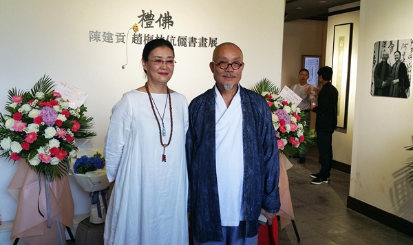 【永武、敏婷/摄影报道】2018年9月22日下午,在西安高新锦业美术馆,一场“礼佛”书画盛宴如期而至。 由陕西省书法家协会、陕西省美术家协会、长安画派文投集团主办的“礼佛——陈建贡赵梅林伉俪书画作品展”在梵音袅袅中拉开帷幕。陈建贡、赵梅林是陕西书画界难得的一对艺术伉俪,两人举案齐眉、志同道合,多年一起研习书道画技,论经谈文。书者陈建贡,以高古简书入手,融入金文、篆书、汉隶,形成了陈建贡特有的书体,有学者将此书体称为“建贡体”。其飘逸的线条,稚拙的象形,律动的飞白,在古风盎然中又不失当代对形式美的追求。而画者赵梅林,以魏晋隋唐佛教艺术为源,借鉴壁画、唐卡、雕塑,甚至西画,所绘佛菩萨脱俗超然,不染尘埃。陈建贡、赵梅林二人的书画合璧更是相得益彰,熠熠生辉。